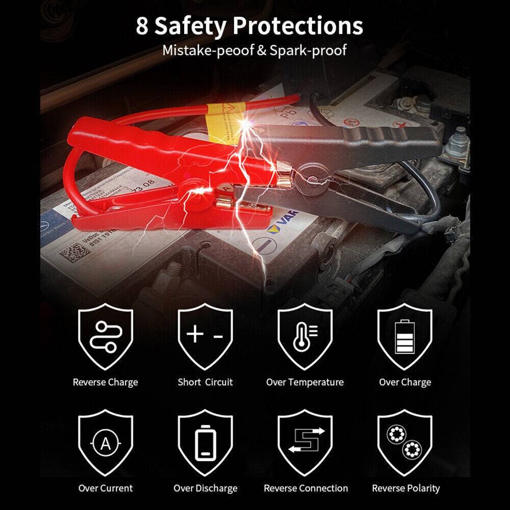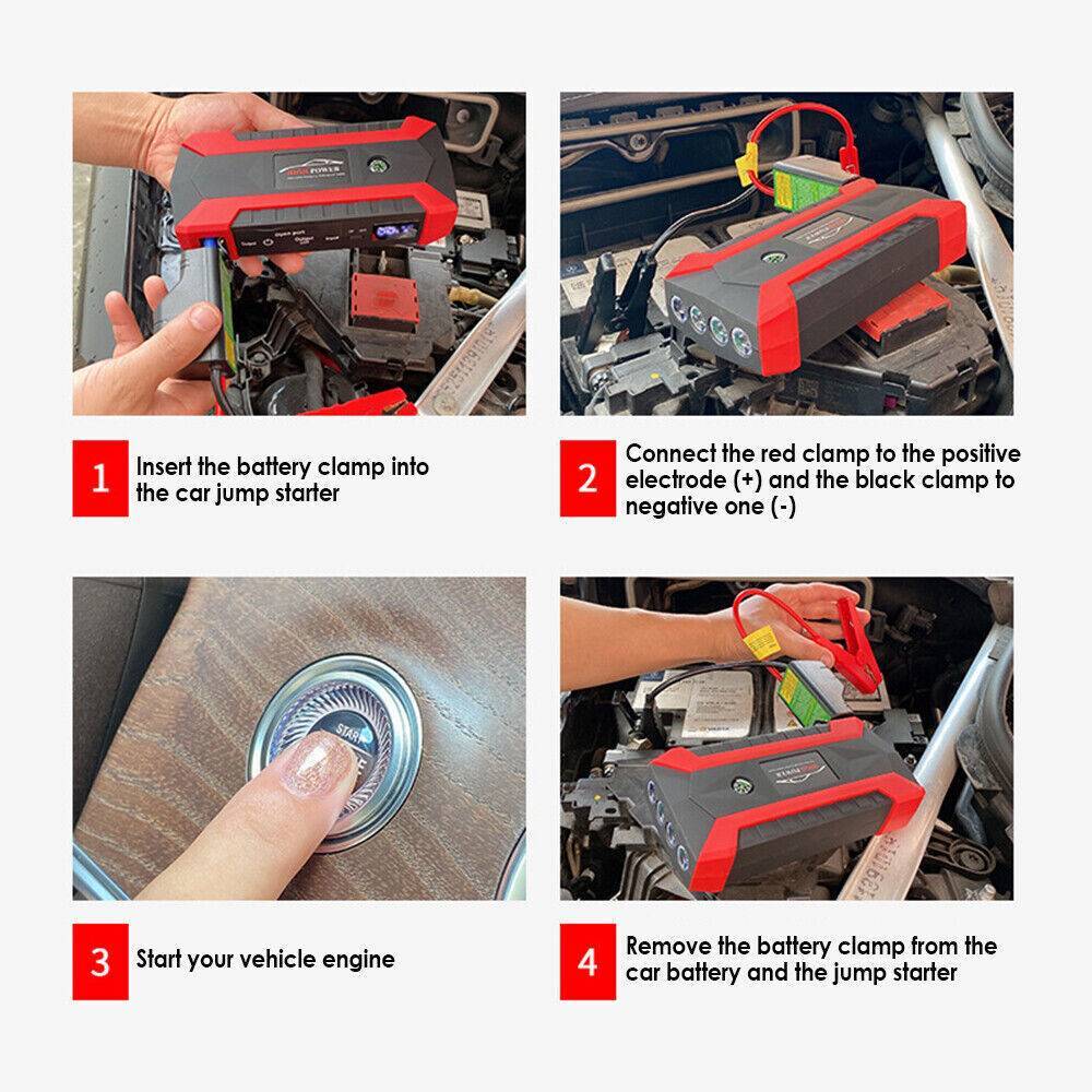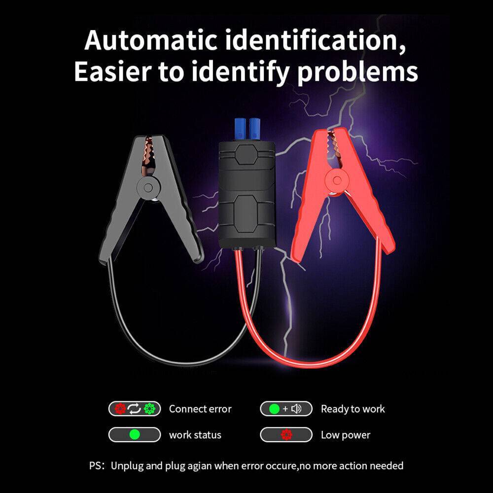 Easy to Use : Just connect the clamp to the car battery and turn on the device, and then the car can start. (Note: Red clip connects to the positive pole, and black clip connects to the negative pole.)